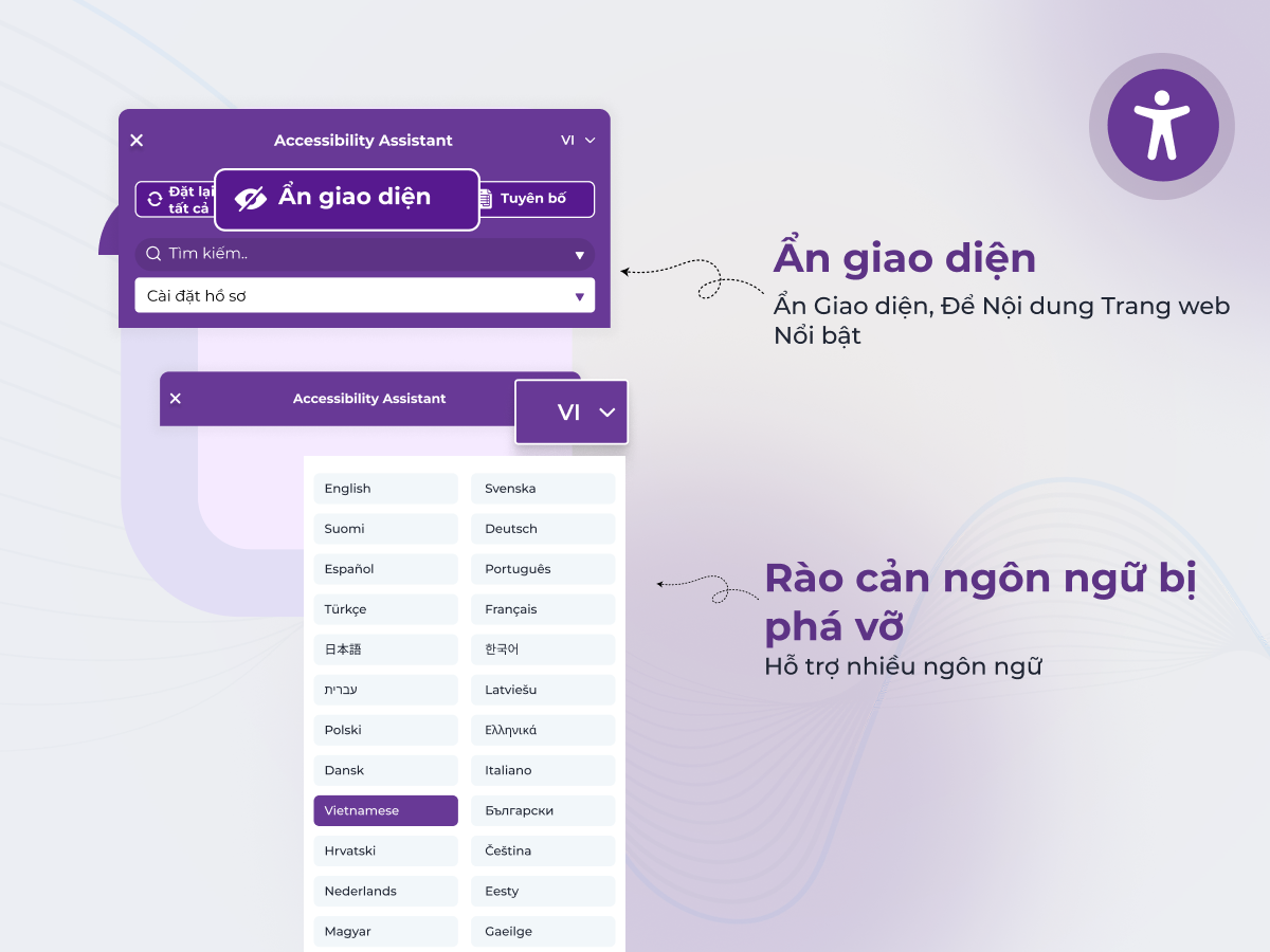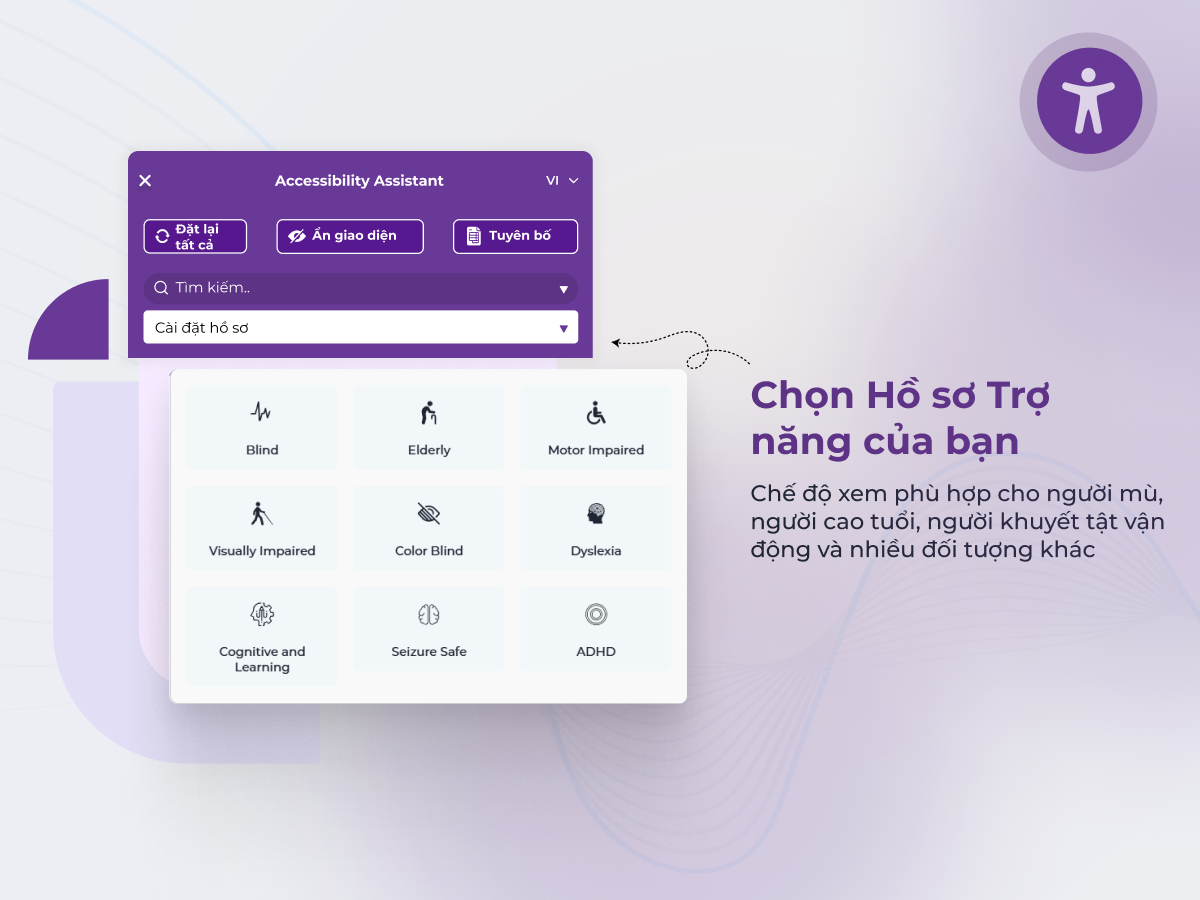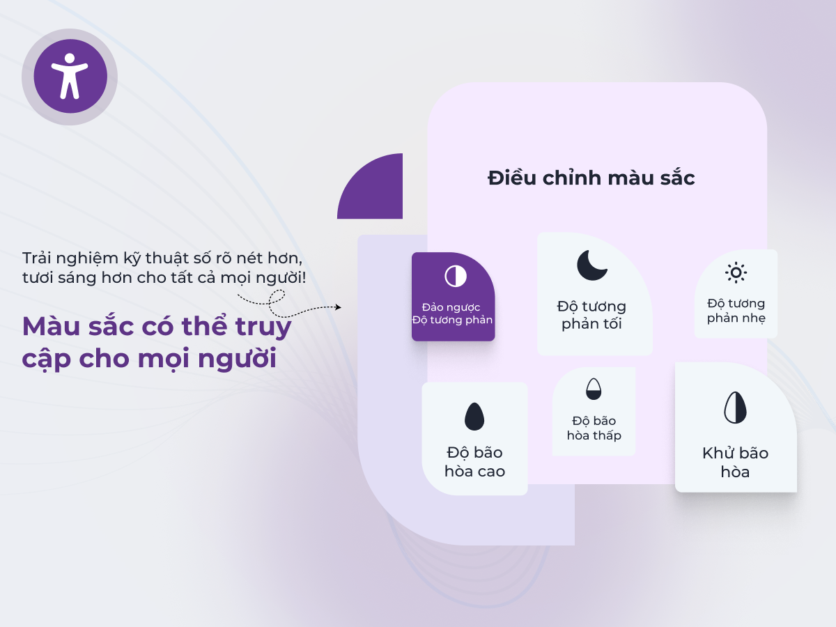 → Tùy chỉnh bố cục, vị trí, kích cỡ, màu sắc, biểu tượng tiện ích để phù hợp thương hiệu. Bật/tắt hình ảnh, video, GIF, hoạt ảnh. Hỗ trợ điều hướng bằng bàn phím, con trỏ lớn, bỏ qua nội dung, tạm dừng hoạt ảnh, thay đổi tỷ lệ nội dung.
