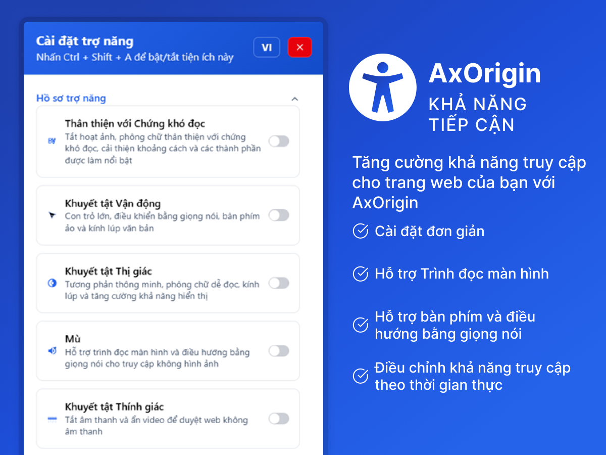 Tiện ích hỗ trợ AI của chúng tôi hoạt động theo hai cách chính: Thứ nhất, nó hoạt động liền mạch ở chế độ nền để tự động cải thiện văn bản thay thế hình ảnh, cải thiện điều hướng bàn phím và giải quyết các vấn đề về khả năng truy cập trên trang web của bạn. Thứ hai, giao diện hỗ trợ truy cập cho phép người dùng tùy chỉnh giao diện người dùng và thiết kế trang web theo yêu cầu cụ thể của họ. Ứng dụng AxOrigin Accessibility cải thiện đáng kể khả năng truy cập trang web cho những người khiếm thính hoặc khiếm thị, khuyết tật vận động, mù màu, chứng khó đọc, các vấn đề về nhận thức và học tập, rối loạn co giật, động kinh và ADHD.