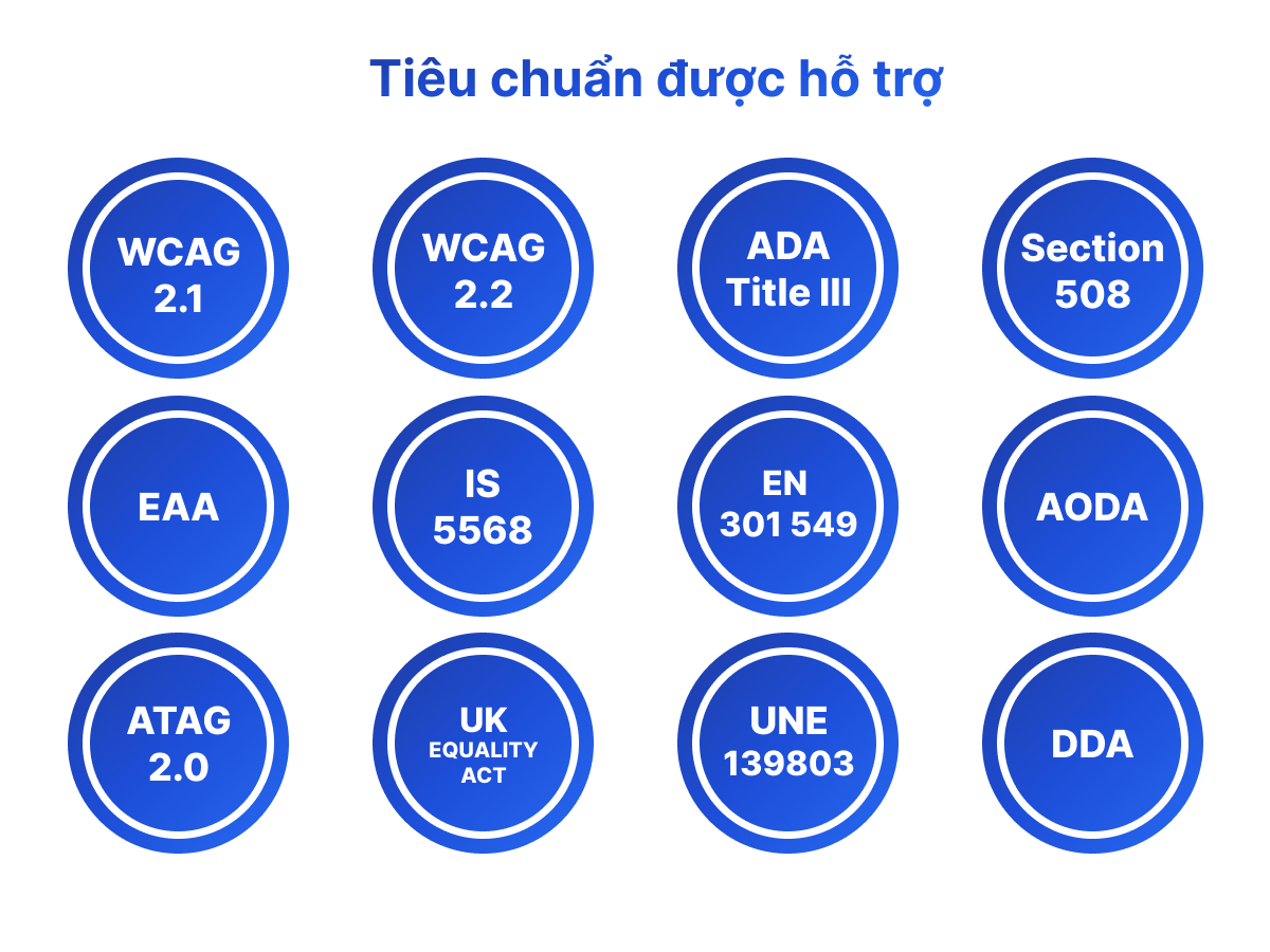 Tiện ích Trợ năng AxOrigin tăng cường khả năng tuân thủ của trang web với các quy định của ADA và cải thiện trải nghiệm duyệt web theo nhiều tiêu chuẩn trợ năng khác nhau, bao gồm WCAG 2.0, 2.1 và 2.2; Mục 508; Đạo luật Unruh của California; RGAA của Pháp; EAA EN 301 549 của Châu Âu; UNE 139803:2012 của Tây Ban Nha; Đạo luật Bình đẳng (EA) của Vương quốc Anh; DDA của Úc; Tiêu chuẩn 5568 của Israel; AODA của Ontario; ACA của Canada; BITV của Đức; Luật Hòa nhập của Brazil (LBI 13.146/2015); JIS X 8341 của Nhật Bản; Đạo luật Stanca của Ý; và Tiêu chuẩn DDA của Thụy Sĩ