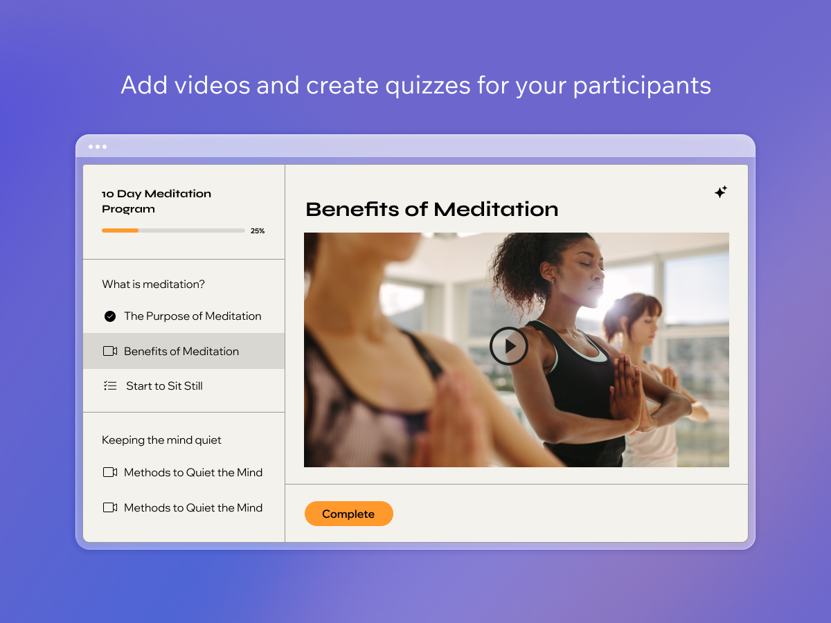 Thu hút người tham dự bằng các chương trình trực tuyến từng bước. Các mẫu tùy chỉnh hoàn toàn giúp thiết lập nhanh chóng và dễ dàng. Sử dụng vô vàn tùy chọn thiết kế để tạo nên giao diện phù hợp. Tải lên các tệp âm thanh, video và PDF để lấp đầy nội dung của chương trình. Cuối cùng, ghép nối chương trình với Wix Groups để tạo không gian dành riêng cho thành viên tham dự. Phù hợp với các mục đích giáo dục, thể hình, dinh dưỡng, v.v.